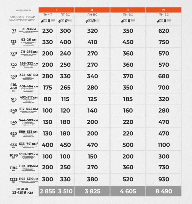 От 230 до 8490 руб. в зависимости от участка, дня недели, способа оплаты, категории транспортного средства
