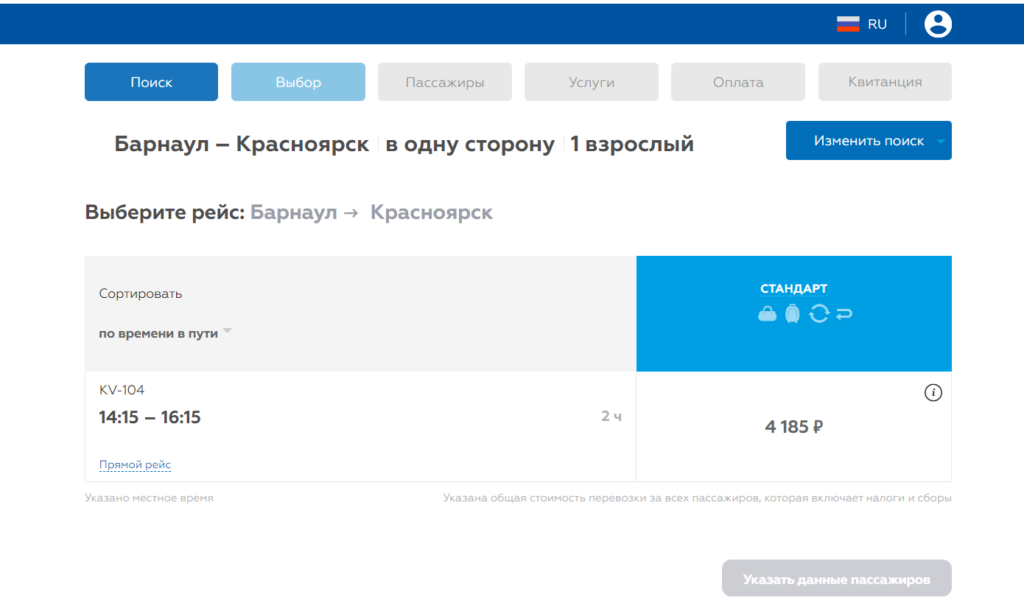 - Перед клиентом открывается список подходящих рейсов. Время указывается местное. Стоимость перевозки — общая, включая налоги. Наведя курсор на букву i, можно увидеть количество оставшихся мест на тот или иной рейс.