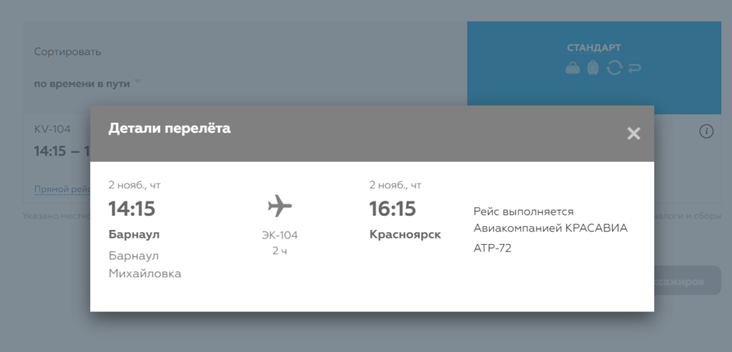- Щелкнув на синюю ссылку в левой нижней части экрана можно увидеть детали перелета.
