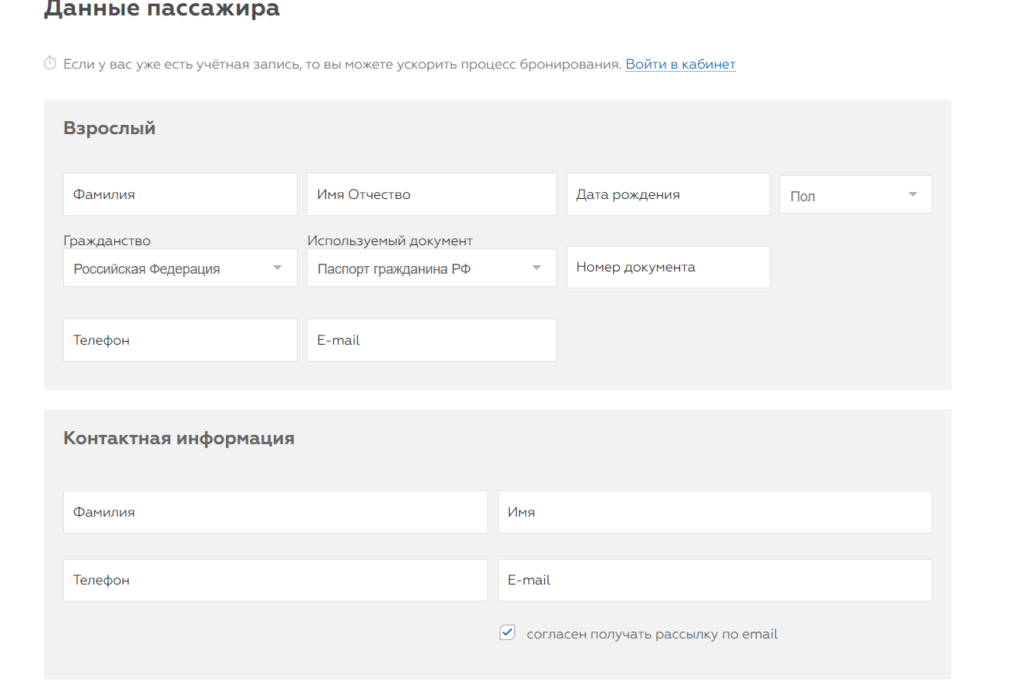- Следующий шаг — внесение данных о пассажире. Требуется вбить фамилию, имя и отчество полностью, дату рождения, пол, гражданство (выбрать из выпадающего списка разных), используемый документ (паспорт, заграничный паспорт, свидетельство о рождении), номер документа, телефон и адрес электронной почты.✅Согласие на получение рассылки по email можно не давать — оно не обязательно, а вот без согласия на обработку хранение персональных данных выкупить билет не получится.