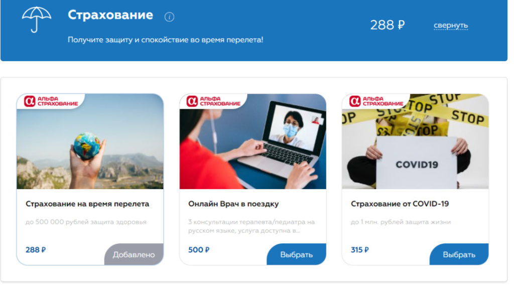 Можно заказать услугу страхования на время перелета. Стоимость страхового полиса можно вернуть, но только до вылета. По утере или порче багажа можно получить до 45 000 руб., при задержке рейса — до 10 000 руб., по защите здоровья — до 500 000 руб.