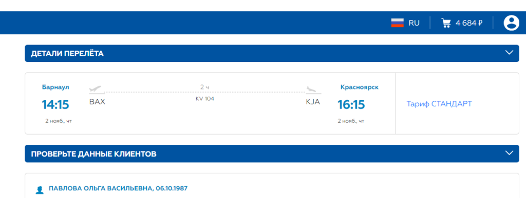 - В следующем окне пассажиру предлагается проверить данные.