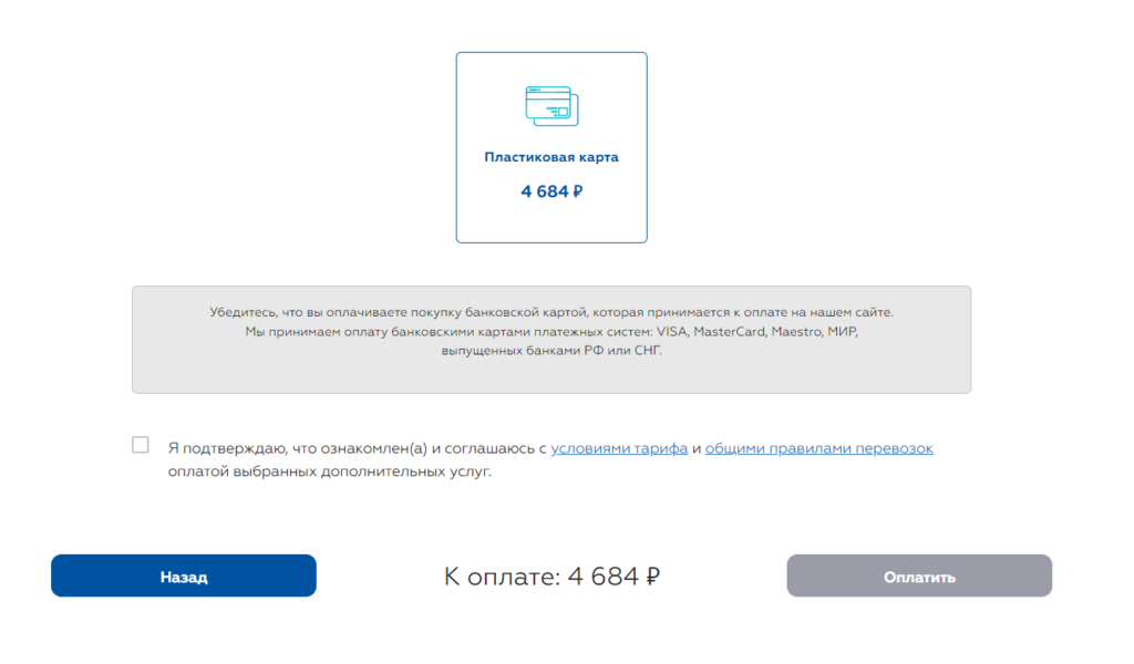 - Последний этап — оплата. Оплату можно произвести с помощью банковской карты (VISA, MasterCard, Maestro, МИР, выпущенных банками РФ или СНГ), через сервис быстрых платежей (СБП) и сервис Sber Pay. Вновь требуется подтвердить согласие с тарифами и правилами перевозки.