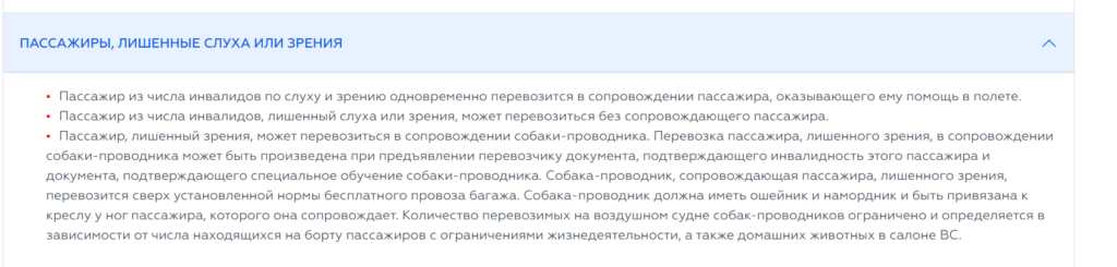 Слепой пассажир имеет право лететь вместе с собакой-проводником. Необходимо перед полетом предъявить перевозчику документ, подтверждающий инвалидность человека и документ, подтверждающий, что собака-поводырь прошла специальное обучение. Питомец перевозится строго в ошейнике и наморднике, пристегнутый к креслу у ног слепого пассажира.