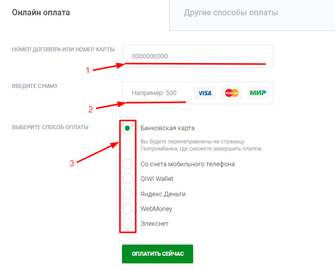 Когда будете выбирать способ оплаты картой через сайт «НТВ-ПЛЮС» система осуществит перенаправление на страницу нужного банка: например «Газпромбанка». В отдельном поле потребуется указать номер смарт-карты или номер договора на обслуживание, номер банковской карты, а также сумму к списанию. Номер договора есть в «Личном кабинете» абонента на сайте провайдера. Если вы его не знаете, то можно выяснить по телефону горячей линии – 8(800)5556789.