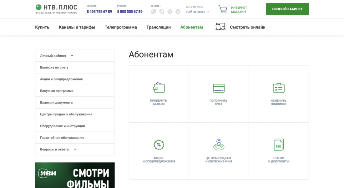 «НТВ-ПЛЮС» предлагает удобный личный кабинет для клиентов, где можно просмотреть информацию о текущем тарифе, оплатить услуги, управлять подпиской и многое другое. Он доступен на сайте компании и позволяет сэкономить время и упростить процесс оплаты.