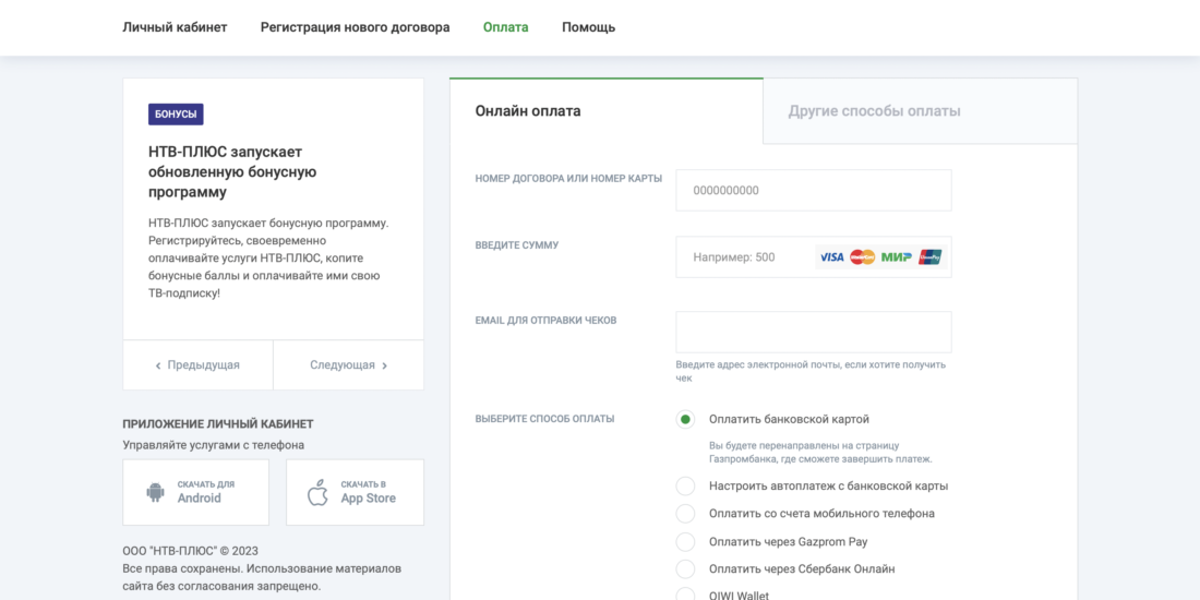 Во всех основных операторах России («МТС», «МЕГАФОН», «Билайн», «ТЕЛЕ2») можно оплачивать услуги по договору «НТВ-ПЛЮС» без комиссии.