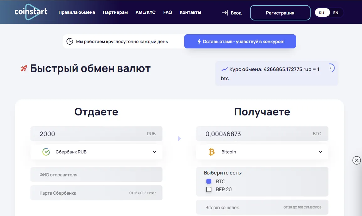 Отзывы на CoinStart — криптообменник, работающий с СБП