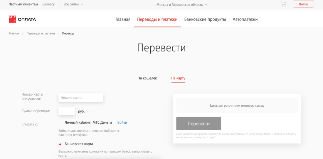 Для онлайн-перевода через приложение «МТС банка» или сервис «МТС деньги» требуется: