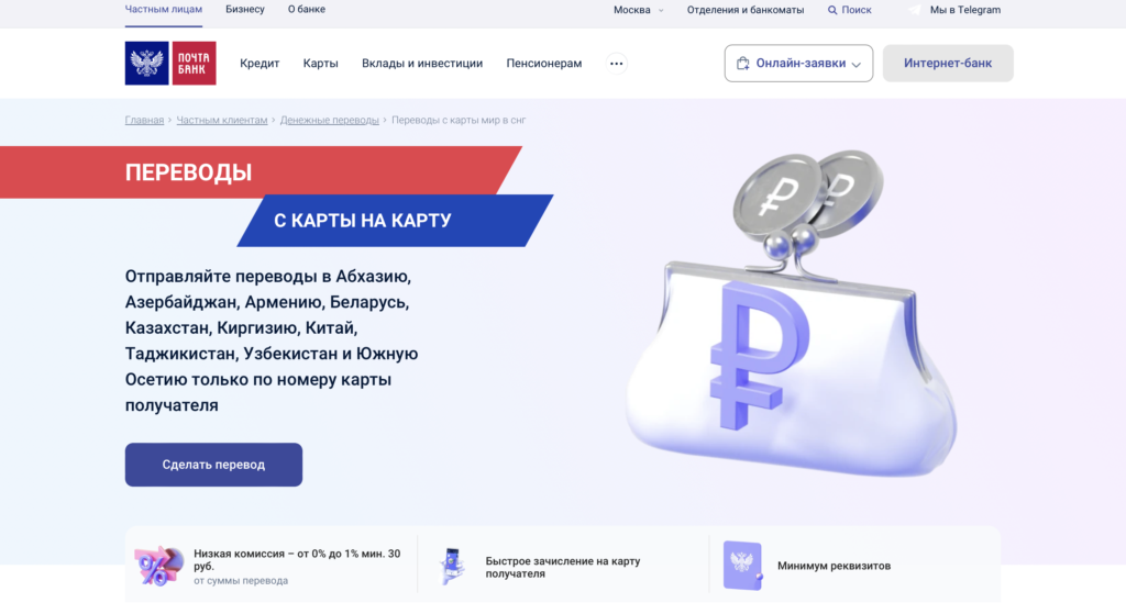 Это российский розничный банк, который отличается от других возможностью переводов с карты на карту в СНГ в партнерстве с системой МИР и с моментальным зачислением на карту получателя.