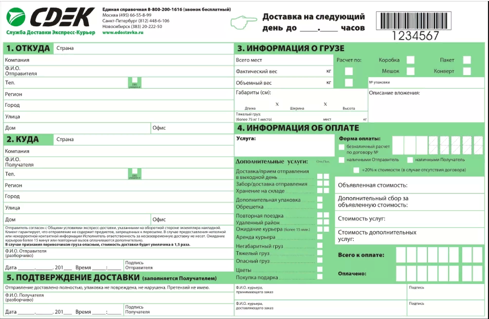 При оплате наличными необходимо заполнить стандартную накладную, в которую необходимо внести рассчитанную стоимость перевозки отправления и отметка о произведенной оплате наличными денежными средствами.