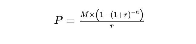- r — ежемесячная процентная ставка (годовая ставка делится на 12 и выражается в десятичной форме, например, 5% = 0.05 / 12),