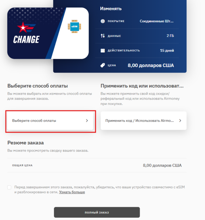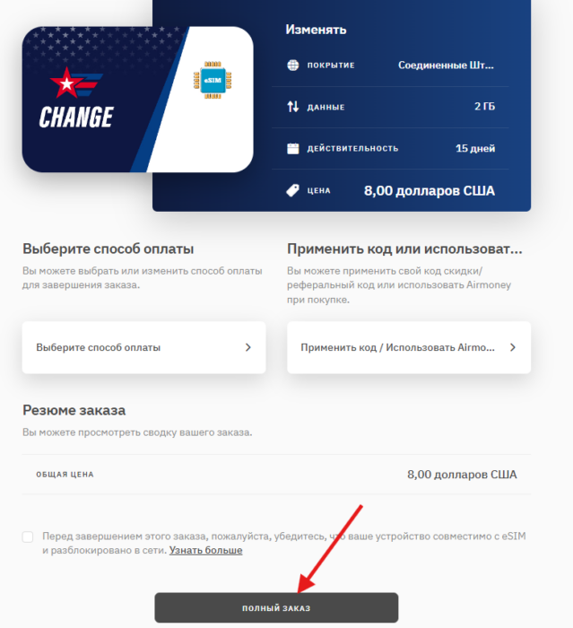 - После возврата к форме покупки, нажмите «Полный заказ».