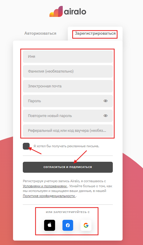 На вкладке «Зарегистрироваться» представлено несколько способов регистрации, мы рассмотрим метод через электронную почту. Ведите свои данные, а именно: имя, фамилию, электронную почту, реферальный код (если есть). Придумайте надежный пароль. Поставьте галочку, если хотите получать рассылку. Нажмите на кнопку «Согласиться и подписаться».