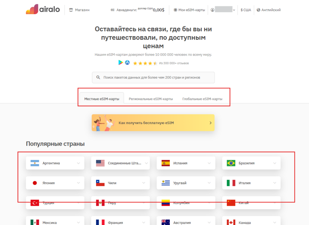 - На главной странице Airalo откройте вкладку вида eSIM, который вас интересует (Местные, Региональные, Глобальные). Выберите страну, которая вам подходит.