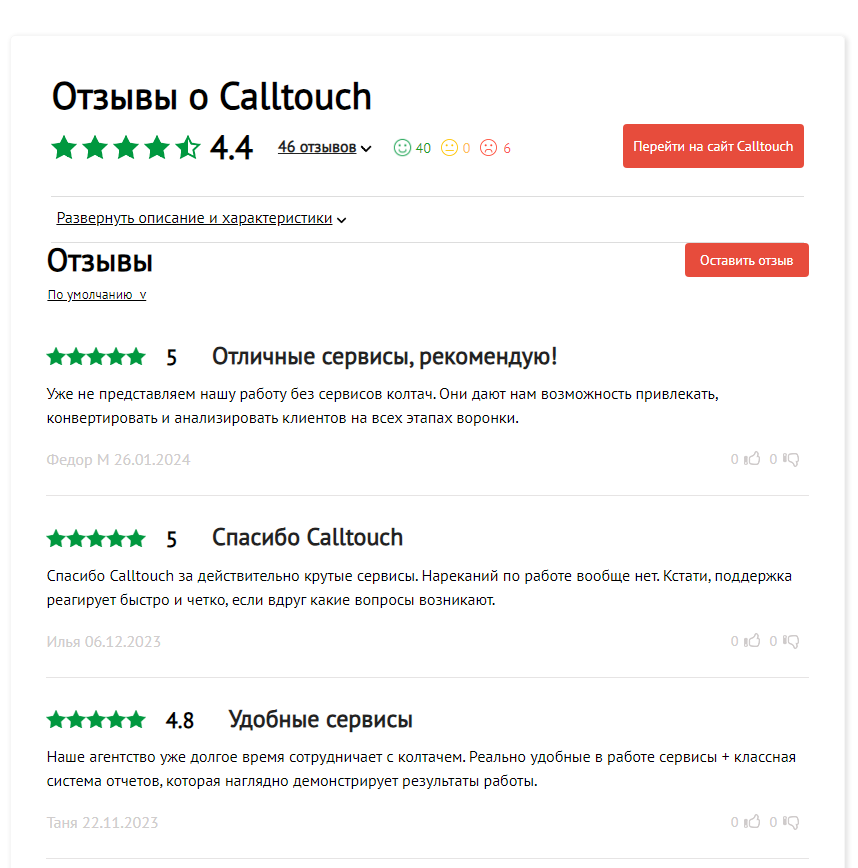В Calltouch собраны вместе инструменты для повышения конверсии, привлечения аудитории и аналитики данных (система для осуществления сквозной аналитики). Онлайн-сервис легко интегрируется с известными системами (Яндекс.Директ, ВК, Auto.ru, ЦИАН, Битрикс24 и др.).