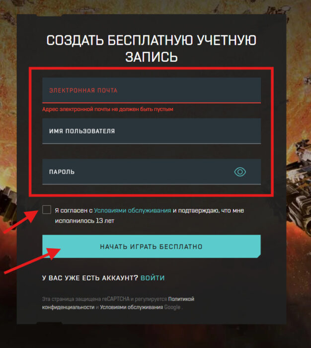 - Для создания нового аккаунта введите электронную почту, Придумайте себе ник (имя пользователя) и надежный пароль. Для подтверждения возраста и согласия с условиями сервиса, поставьте соответствующую галочку. Нажмите кнопку «Начать играть бесплатно».