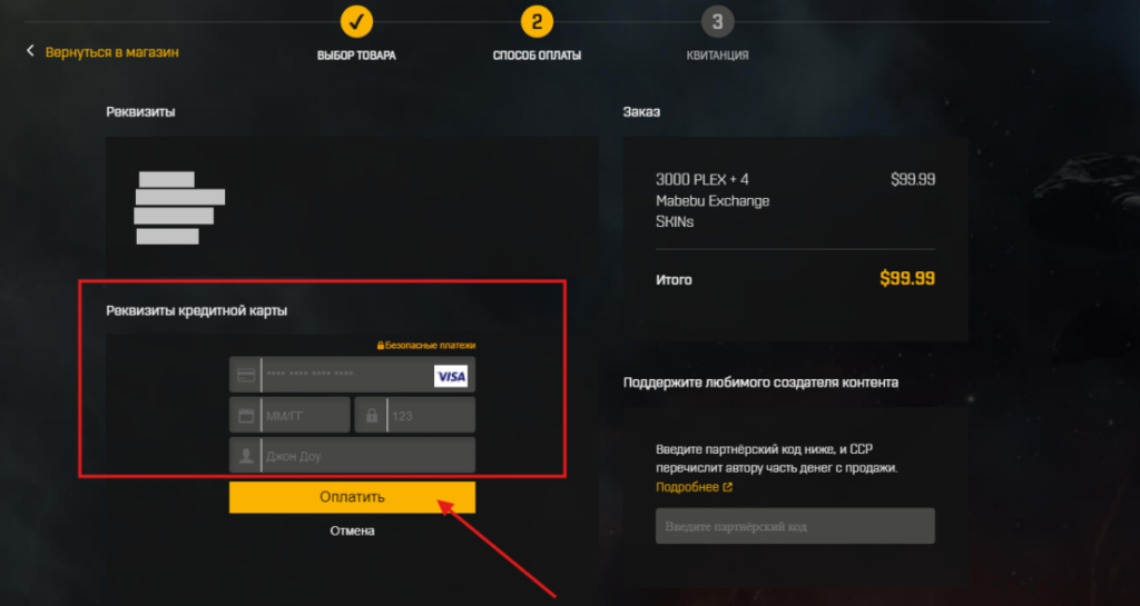 - Заполните реквизиты вашей карты (номер, срок действия, код и имя владельца) и нажмите на кнопку «Оплатить».