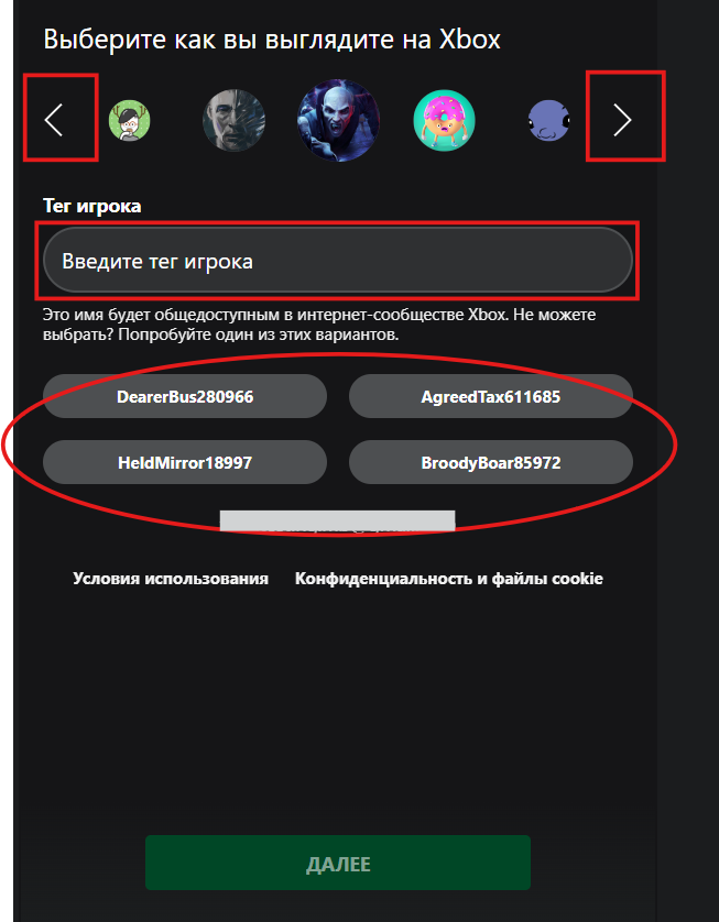 - В следующем окне выберите картинку для аватара, используя стрелки. Придумайте Тег (Ник) игрока или выберите один из предложенных системой. Нажмите на кнопку «Далее».