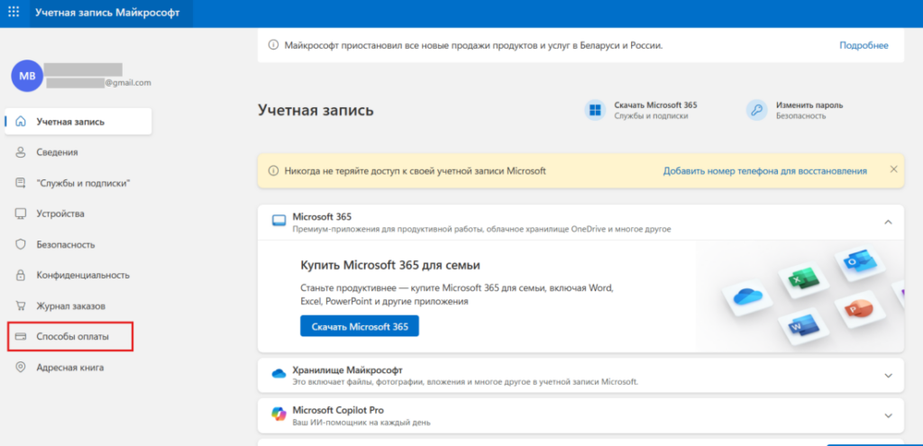 - На открывшейся странице выберите «Способы оплаты» в списке быстрых ссылок в левой части экрана.