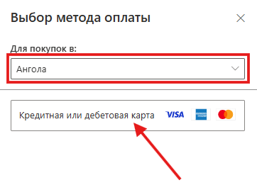 - В правой части экрана появится окно «Выбор метода оплаты». Выберите страну, соответствующую билинг-адресу вашей виртуальной карты. Как узнать билинг-адрес для вашей виртуальной карты Wanttopay мы рассмотрели в пункте 6 данной инструкции. Нажмите «Кредитная или дебетовая карта».