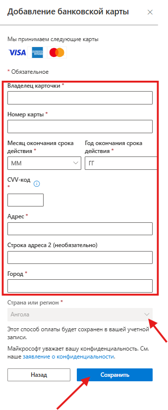 - Заполните платежные реквизиты карты. Вам понадобится: имя и фамилия владельца, номер карты, срок действия, защитный код (CVC), билинг-адрес. Убедитесь, что в графе «Страна или регион» верно указана страна, соответствующая билинг-адресу. Нажмите «Сохранить».