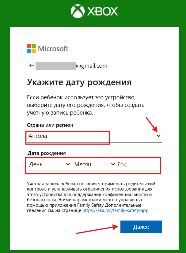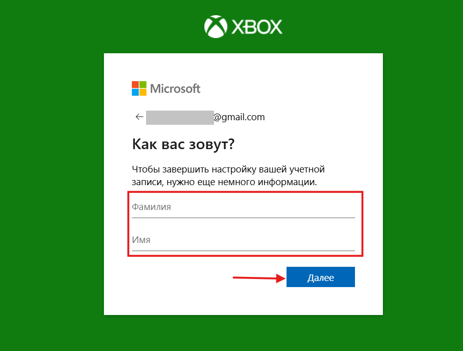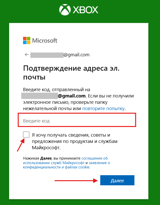- Вернитесь на сайт Game Pass и введите код. Если хотите получать рассылку, поставьте галочку. Нажмите на кнопку «Далее».
