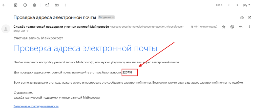 - Зайдите в вашу электронную почту и откройте письмо от Майкрософт. Скопируйте проверочный код.