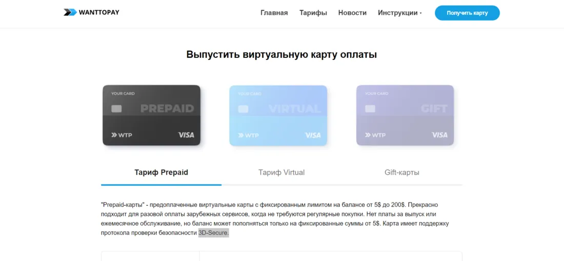 Wanttopay — онлайн-сервис, где можно быстро оформить prepaid карту с лимитом на балансе от 5$ до 200$. Отлично подходит для разовых покупок и оплаты зарубежных сервисов, когда не нужно совершать платежи регулярно.