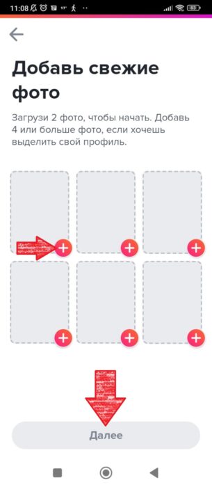 - Добавьте минимум две фотографии, нажатием на «+». Для продолжения нажмите «Далее».
