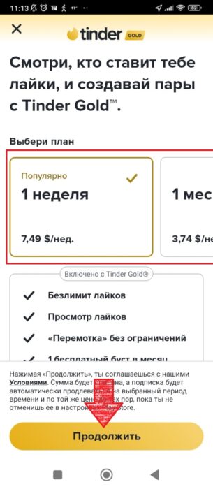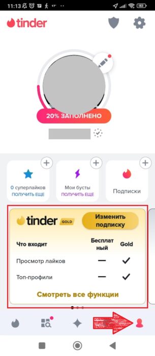 - Нажмите на значок профиля в правой нижней части экрана и, далее, выберите «Tinder gold», для оформления платных услуг.