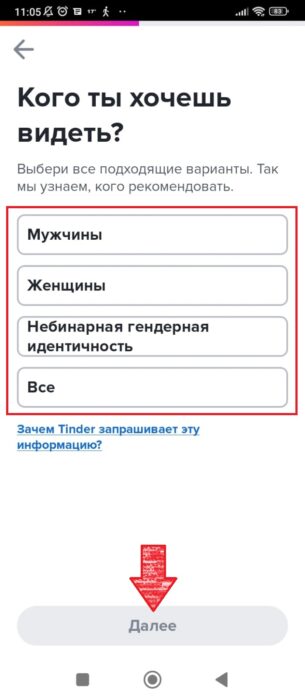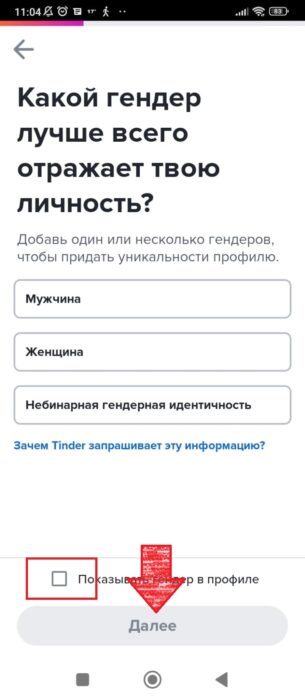 - Выберите гендер, поставьте галочку, если хотите, что б эту информацию видели другие пользователи. Нажмите кнопку «Далее».