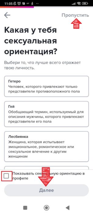 Укажите свою ориентацию, поставьте галочку, если хотите, что б эту информацию видели другие пользователи. Нажмите кнопку «Далее».