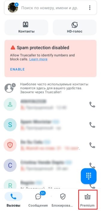 - На главной странице приложения Truecaller нажмите на значок Рremium, он находится в правом нижнем углу.