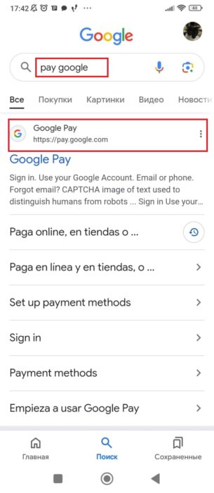 - В поисковой строке введите «pay google». нажмите поиск и далее выберите «Google Pay».