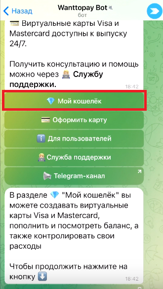 - Введите реквизиты вашей виртуальной карты, начиная с номера. Вам также понадобится билинг-адрес. Биллинг-адрес Wanttopay вы можете узнать в телеграмм боте, для этого выберите «Мой кошелек» и нажмите «Билинг адрес».