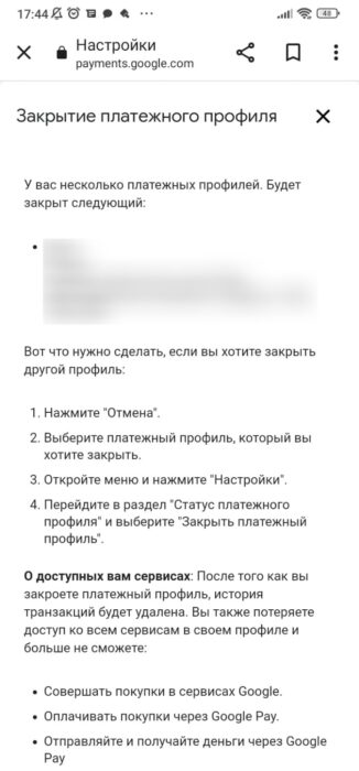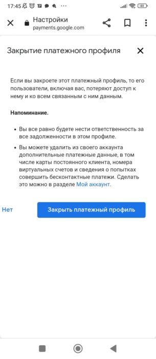 - На следующей странице, еще раз, промотайте максимально вниз и нажмите «Закрыть платежный профиль».