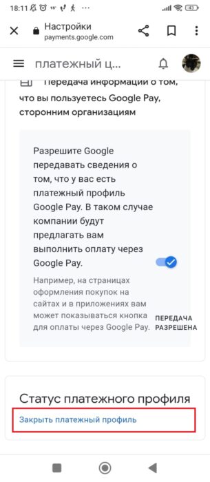 - Далее промотайте страницу максимально вниз и нажмите «Закрыть платежный профиль».